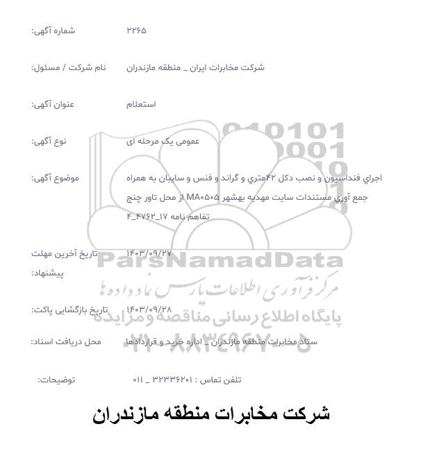 موضوع اگهی: اجرای فونداسیون و نصب دکل 42 متری و گراند و فنس و سایبان به همراه جمع آوری مستندات سایت مهدیه بهشهر MA0505 از محل تاور چنج تفاهم نامه 17-4762-4