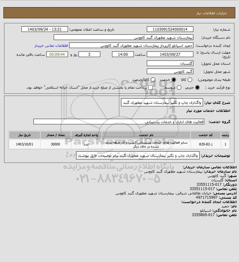 شرح کلی نیاز: واگذاری چاپ و تکثیر بیمارستان شهید مطهری گنبد