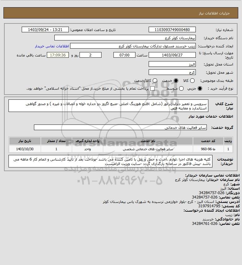 استعلام بها و موضوع استعلام استعلام سرویس و تعمیر دیزل ژنراتور (شامل :فلنج هوزینگ اصلی -منبع اگزوز دو جداره -لوله و اتصالات و غیره ) و صدور گواهی استاندارد و معاینه فنی به اطلاع کلیه شرکتها و افراد متخصص واجد شرایط میرساند، آگهی گذار در نظر دارد از طریق استعلام بها، نسبت به انتخاب و دریافت پیشنهادات اقدام نماید. این استعلام با کد آگهی ثبت شده در سامانه خبرگزاری پارس نماد : 8403265 منتشر شده است. مشخصات استعلام : تاریخ شروع استعلام: 1403/09/24 آخرین مهلت ارسال پیشنهاد قیمت : 1403/09/27 و محل اجرای پروژه : استان البرز میباشد. استعلام قیمت مورد درخواست : استعلام سرویس و تعمیر دیزل ژنراتور (شامل :فلنج هوزینگ اصلی -منبع اگزوز دو جداره -لوله و اتصالات و غیره ) و صدور گواهی استاندارد و معاینه فنی با دستهبندیهای تخصصی و گروه های مرتبط : پیمانکاری برق و الکترونیک, تاسیسات ساختمانی, دیزل ژنراتور, استعلام اطلاع رسانی میگردد.