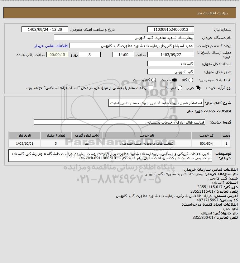 شرح کلی نیاز: استعلام تامین نیروی ضابط قضایی جهت حفظ و تامین امنیت
