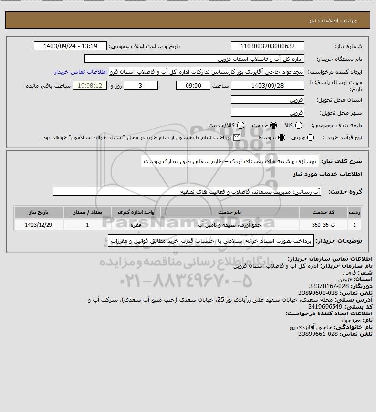 شرح کلی نیاز: بهسازی چشمه های روستای اردک – طارم سفلی طبق مدارک پیوست