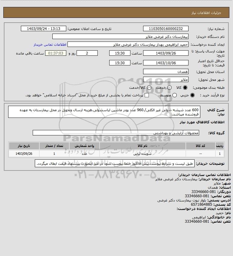استعلام 600 عدد شیشه شوئی غیر الکلی/.960 عدد پودر ماشین لباسشوئی.هزینه ارسال وتحویل در محل بیمارستان به عهده فروشنده میباشد., استعلام 600 عدد شیشه شوئی غیر الکلی/.960 عدد پودر ماشین لباسشوئی.هزینه ارسال وتحویل در محل بیمارستان به عهده فروشنده میباشد.