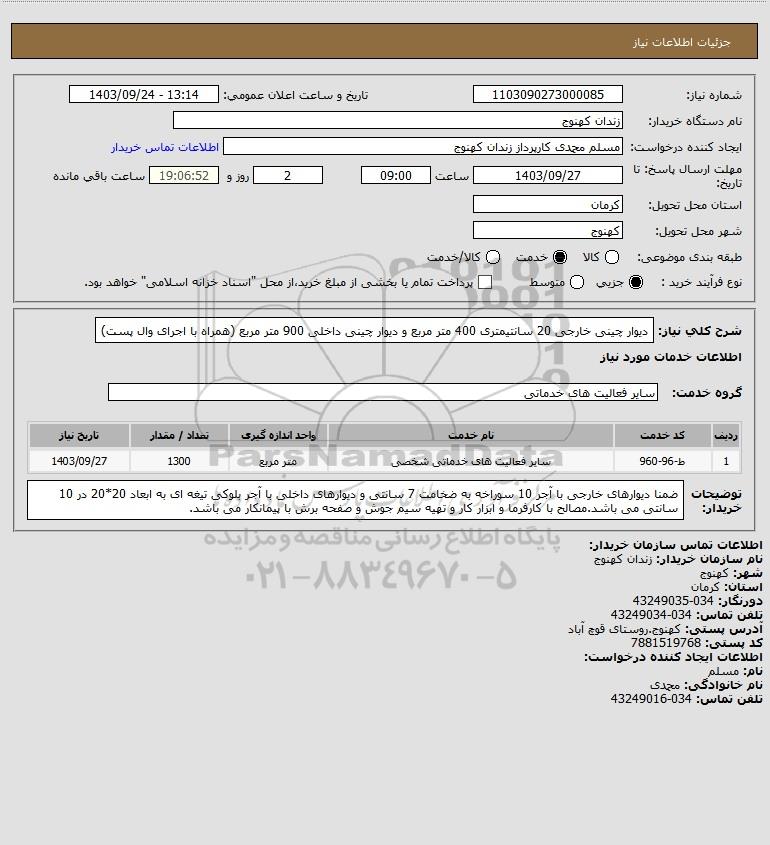 شرح کلی نیاز: دیوار چینی خارجی 20 سانتیمتری 400 متر مربع و دیوار چینی داخلی 900 متر مربع (همراه با اجرای وال پست)