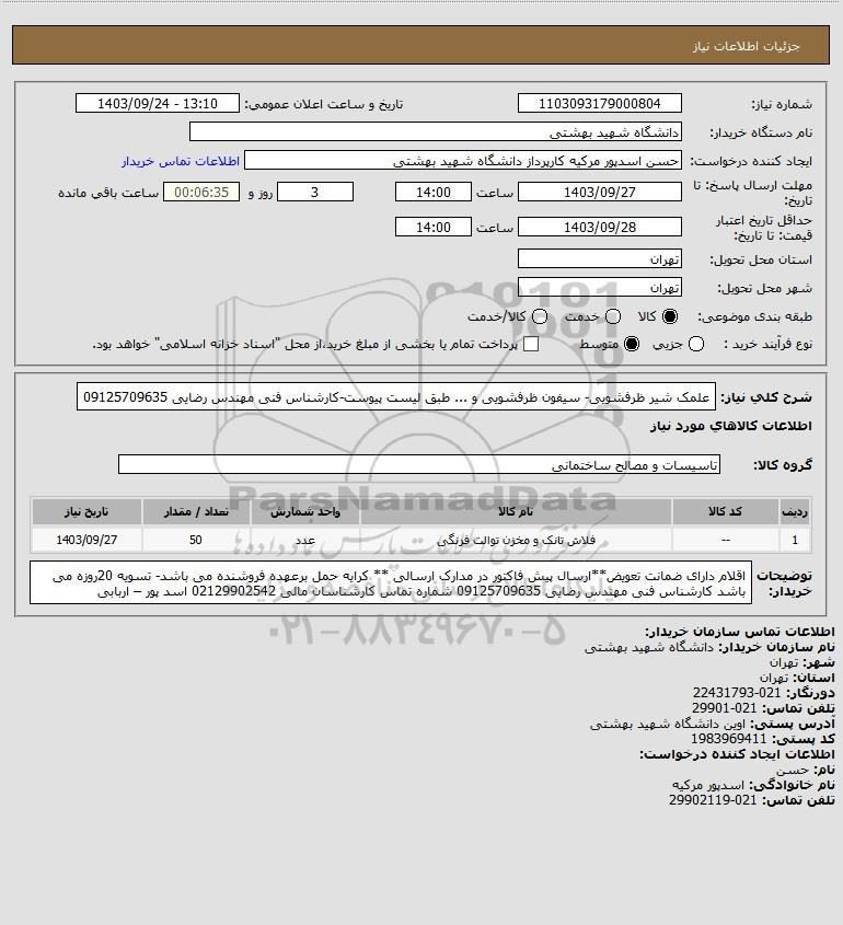 شرح کلی نیاز: علمک شیر ظرفشویی- سیفون ظرفشویی و ... طبق لیست پیوست-کارشناس فنی مهندس رضایی 09125709635