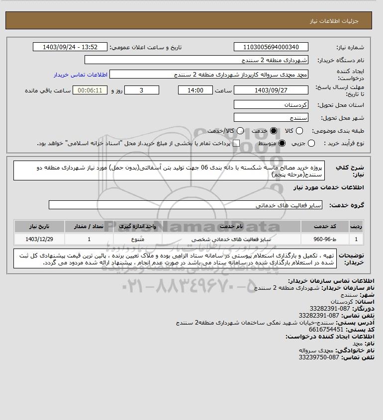 شرح کلی نیاز: پروژه خرید مصالح ماسه شکسته با دانه بندی 06 جهت تولید بتن آسفالتی(بدون حمل) مورد نیاز شهرداری منطقه دو سنندج(مرحله پنجم)