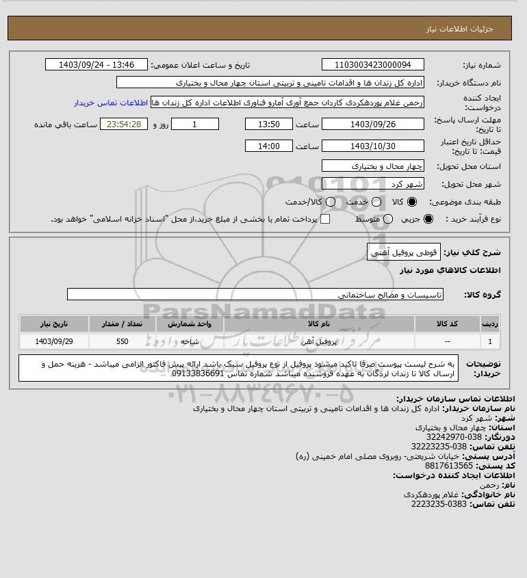 توضیحات خریدار:به شرح لیست پیوست صرفا تاکید میشود پروفیل از نوع پروفیل سبک باشد ارائه پیش فاکتور الزامی میباشد - هزینه حمل و ارسال کالا تا زندان لردگان به عهده فروشنده میباشد شماره تماس 09133836691