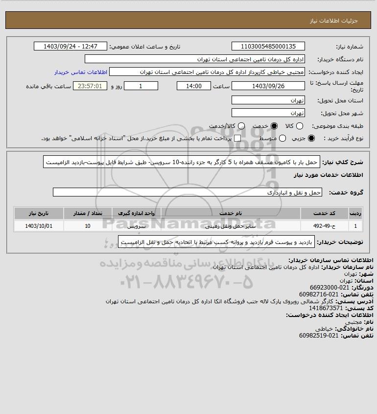 شرح کلی نیاز: حمل بار با کامیون مسقف همراه با 5 کارگر به جزء راننده-10 سرویس- طبق شرایط فایل پیوست-بازدید الزامیست