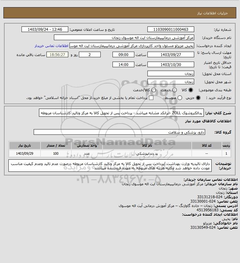 شرح کلی نیاز: پدالکتروشوک ZOLL -ایرانکد مشابه میباشد - پرداخت پس از تحویل کالا به مرکز وتائید کارشناسان مربوطه