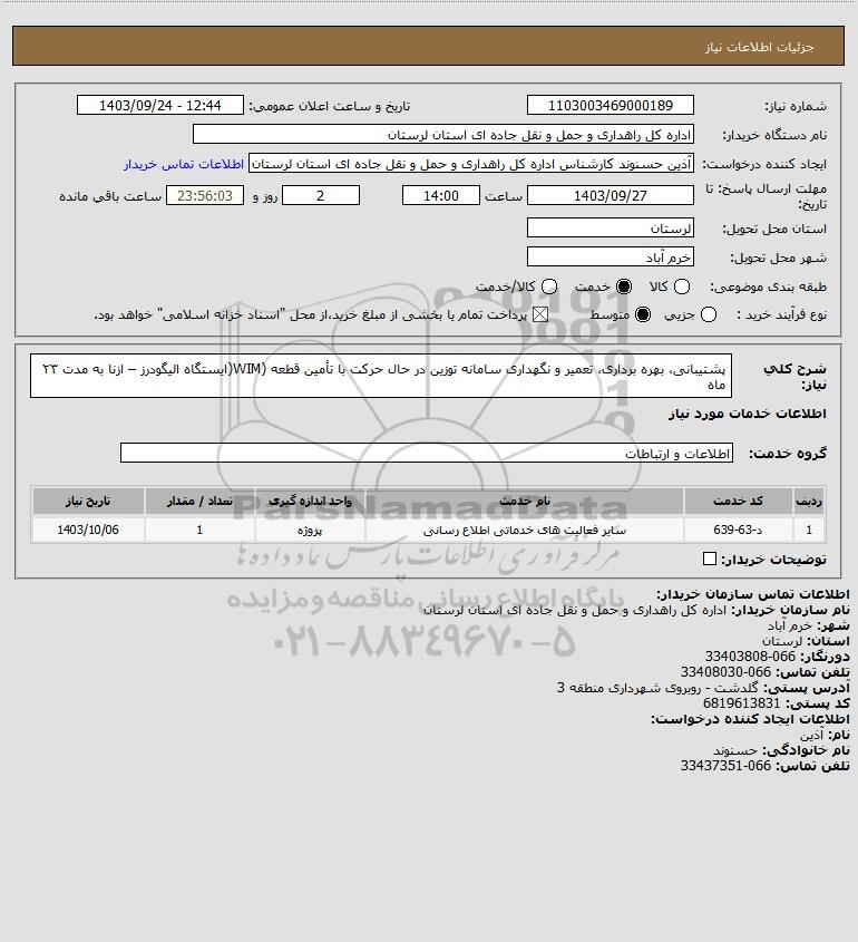 نام دستگاه خریدار:اداره کل راهداری و حمل و نقل جاده ای استان لرستان