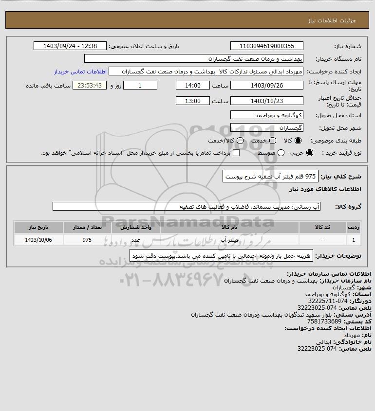 شرح کلی نیاز: 975 قلم فیلتر آب تصفیه شرح پیوست