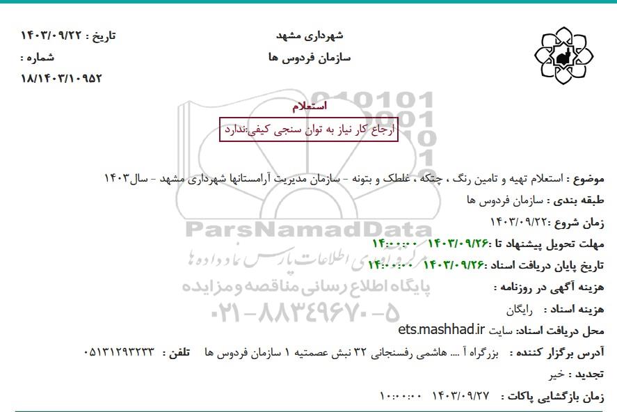موضوع : استعلام تهیه و تامین رنگ ، چتکه ، غلطک و بتونه - سازمان مدیریت آرامستانها شهرداری مشهد سال 1403