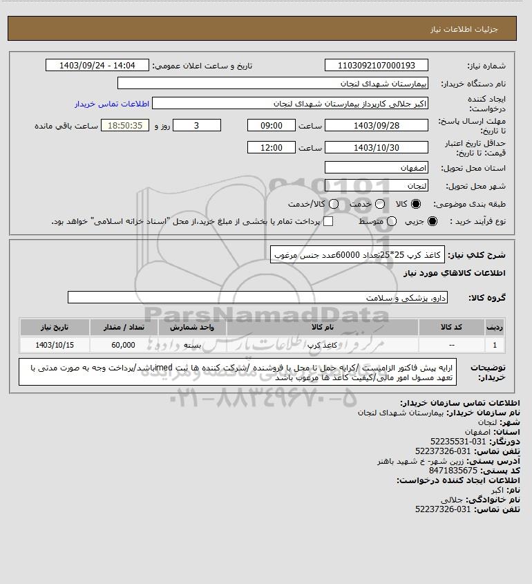 شرح کلی نیاز: کاغذ کرپ 25*25تعداد 60000عدد جنس مرغوب