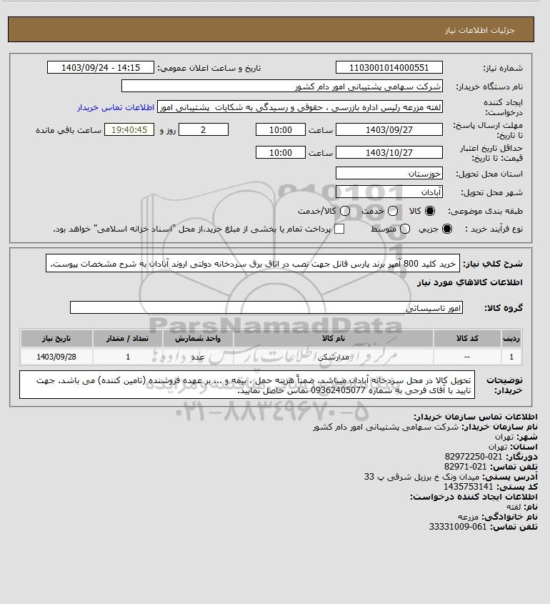 شرح کلی نیاز: خرید کلید 800 آمپر برند پارس فانل جهت نصب در اتاق برق سردخانه دولتی اروند آبادان به شرح مشخصات پیوست.
