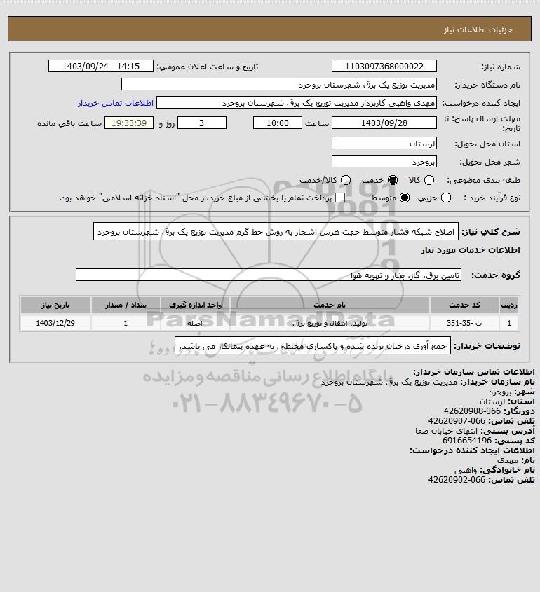 شرح کلی نیاز: اصلاح شبکه فشار متوسط جهت هرس اشچار به روش خط گرم مدیریت توزیع یک برق شهرستان بروجرد
