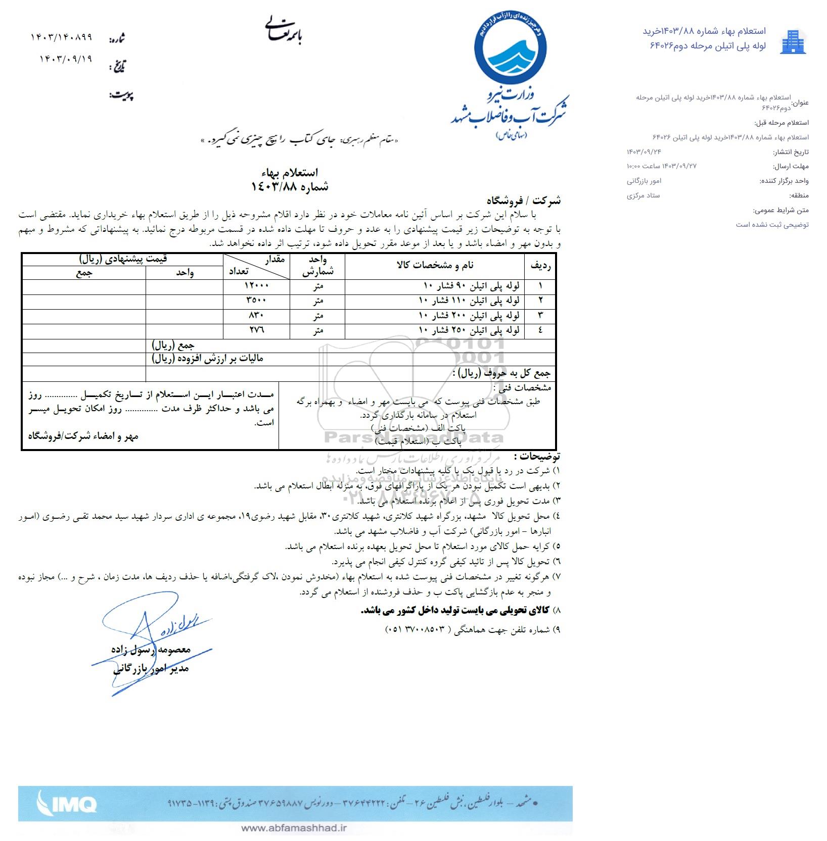 این شرکت براساس آئین نامه معاملات خود در نظر دارد اقلام مشروحه ذیل را از طریق استعلام بها خریداری نماید. مقتضی است با توجه به توضیحات زیر قیمت پیشنهادی را به عدد و حروف تا مهلت داده شده در قسمت مربوطه درج نمائید. به پیشنهاداتی که مشروط و مبهم و بدون مهر و امضا باشد و یا بعد از موعد مقرر اعلام گردد ترتیب اثر داده نخواهد شد.