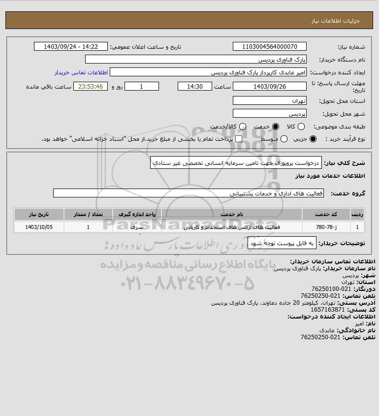 شرح کلی نیاز: درخواست پروپوزال جهت تامین سرمایه انسانی تخصصی غیر ستادی
