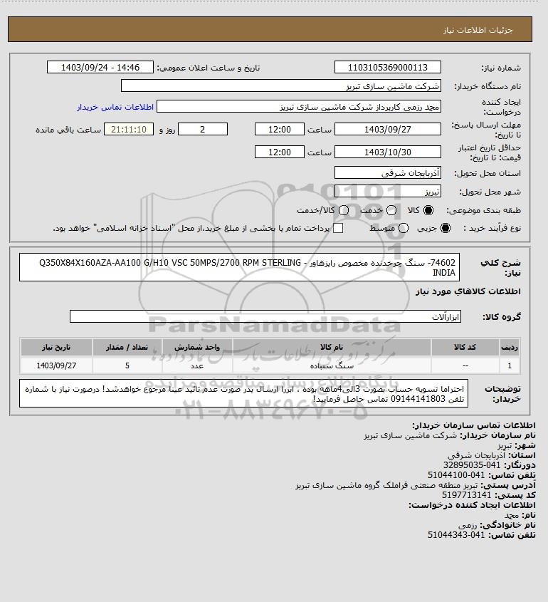 شرح کلی نیاز: 74602- سنگ چرخدنده مخصوص رایزهاور - Q350X84X160AZA-AA100 G/H10 VSC 50MPS/2700 RPM STERLING INDIA
