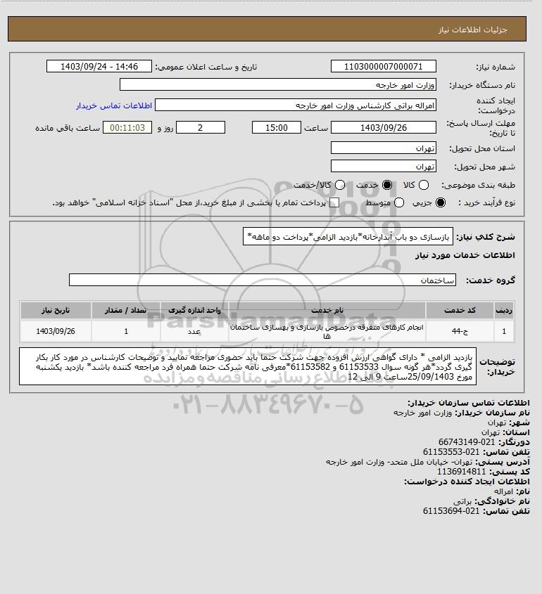 شرح کلی نیاز: بازسازی دو باب آبدارخانه*بازدید الزامی*پرداخت دو ماهه*
