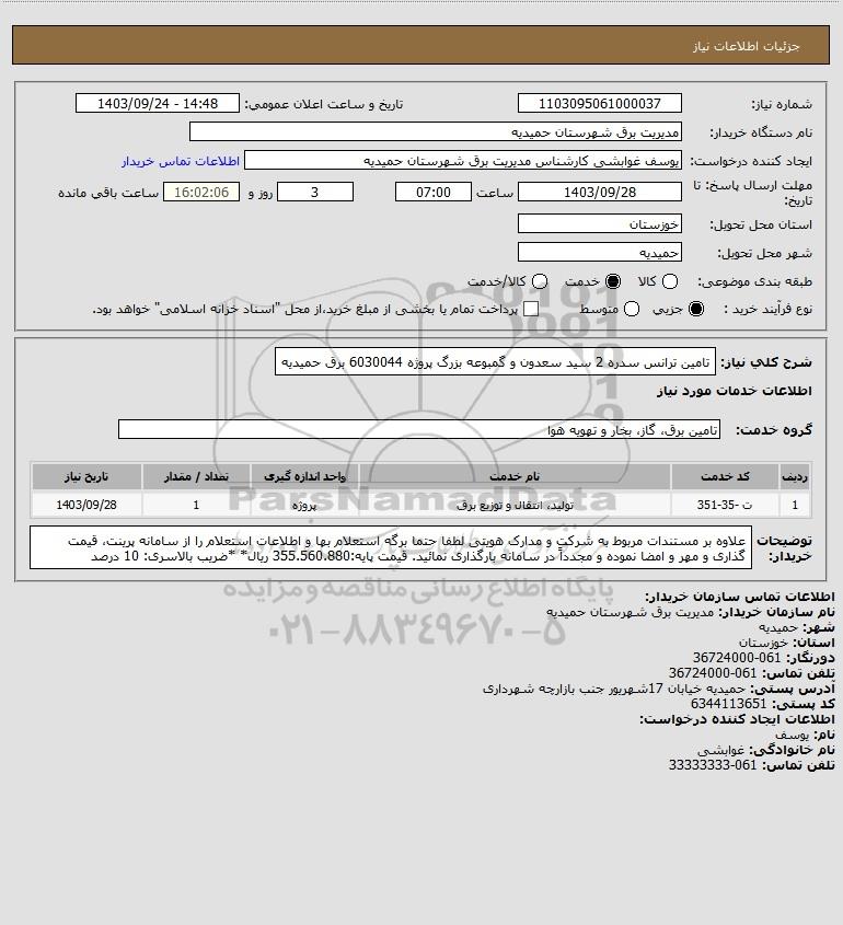 شرح کلی نیاز: تامین ترانس سدره 2 سید سعدون و گمبوعه بزرگ پروژه 6030044 برق حمیدیه