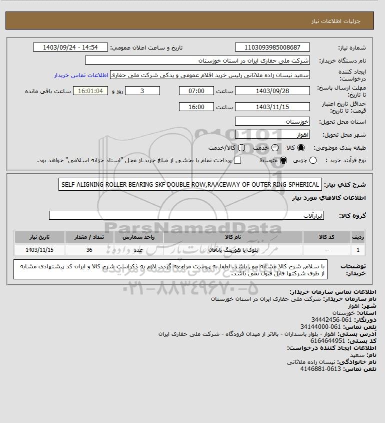 شرح کلی نیاز: SELF ALIGNING ROLLER BEARING SKF DOUBLE ROW,RAACEWAY OF OUTER RING SPHERICAL