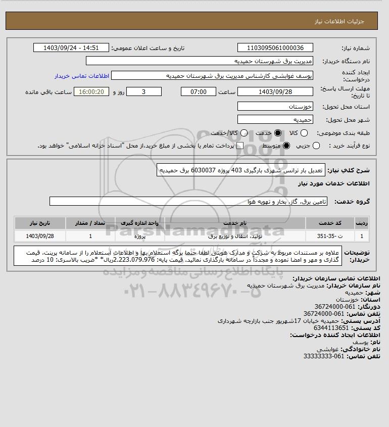 استعلام تعدیل بار ترانس شهری بارگیری 403 پروژه 6030037 برق حمیدیه, استعلام تعدیل بار ترانس شهری بارگیری 403 پروژه 6030037 برق حمیدیه