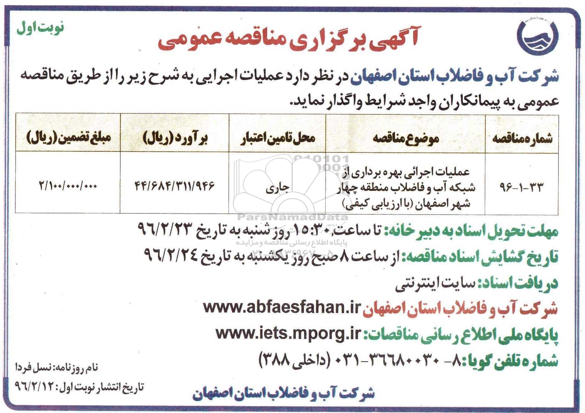 شرکت آب و فاضلاب استان اصفهان در نظر دارد عملیات اجرایی به شرح ذیل را از طریق مناقصه عمومی به پیمانکاران واجد شرایط واگذار نماید