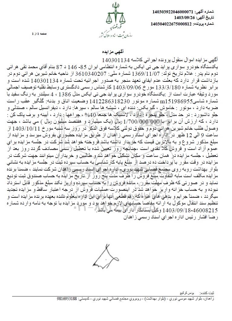 آگهی مزایده اموال منقول پرونده اجرایی کلاسه 140301134