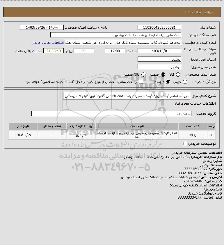شرح کلی نیاز: درج استعلام قیمت پروژه قیمت تعمیرات واحد های اقامتی گناوه طبق فایلهای پیوستی