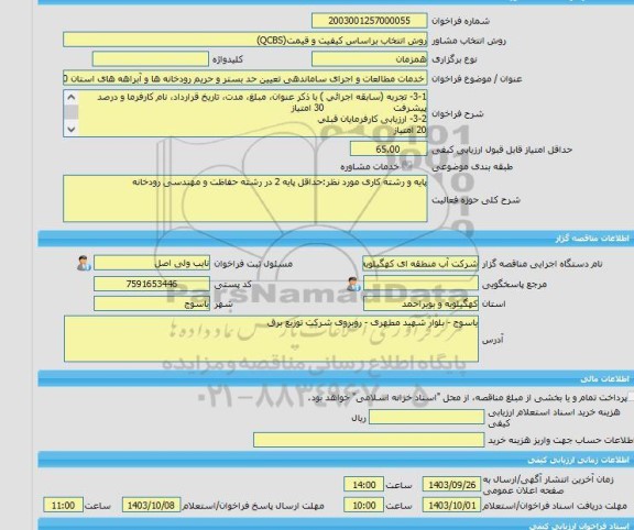 | نام دستگاه اجرایی مناقصه گزار | شرکت آب منطقه ای کهگیلویه و بویر احمد | مسئول ثبت مناقصه | |