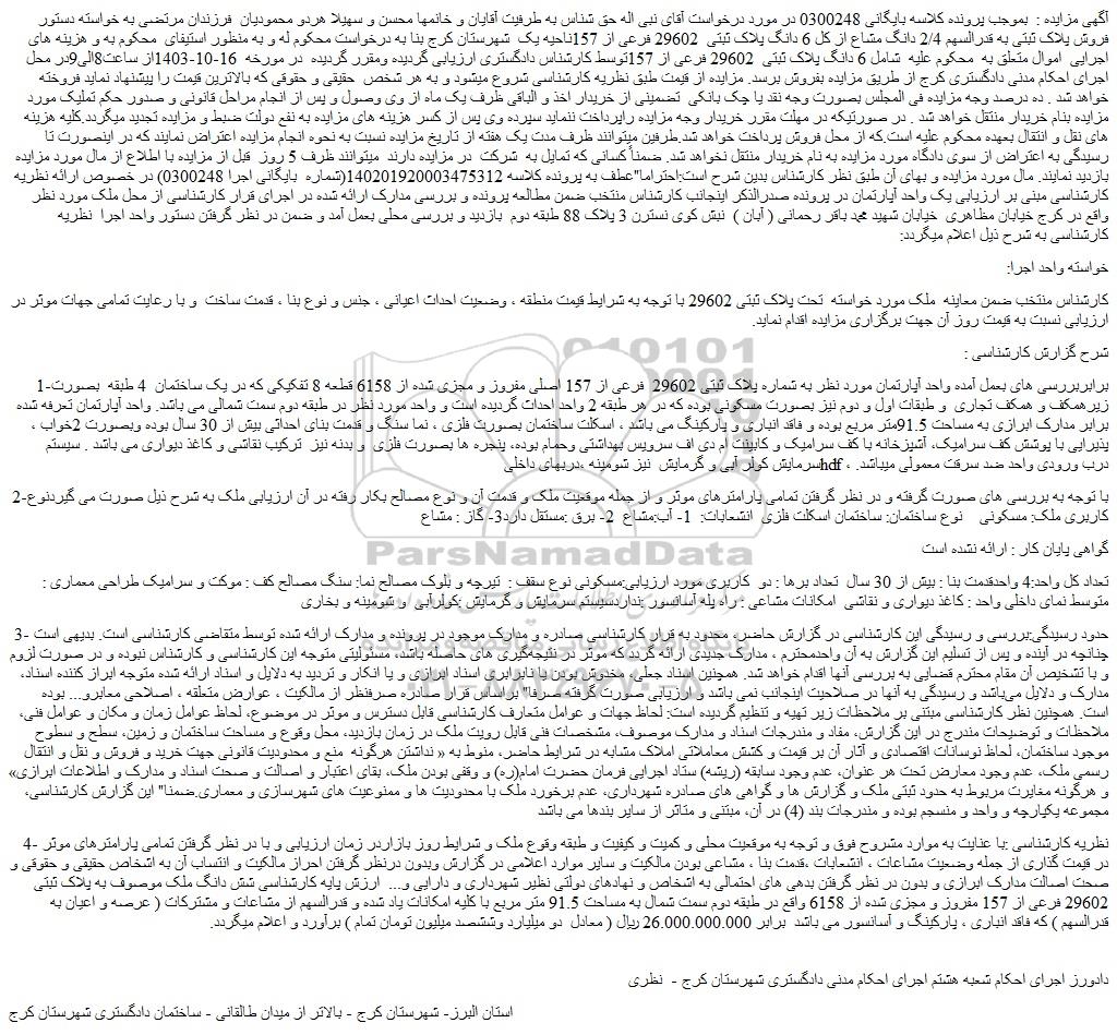 4- نظریه کارشناسی :با عنایت به موارد مشروح فوق و توجه به موقعیت محلی و کمیت و کیفیت و طبقه وقوع ملک و شرایط روز بازاردر زمان ارزیابی و با در نظر گرفتن تمامی پارامترهای موثر در قیمت گذاری از جمله وضعیت مشاعات ، انشعابات ،قدمت بنا ، مشاعی بودن مالکیت و سایر موارد اعلامی در گزارش وبدون درنظر گرفتن احراز مالکیت و انتساب آن به اشخاص حقیقی و حقوقی و صحت اصالت مدارک ابرازی و بدون در نظر گرفتن بدهی های احتمالی به اشخاص و نهادهای دولتی نظیر شهرداری و دارایی و... ارزش پایه کارشناسی شش دانگ ملک موصوف به پلاک ثبتی 29602 فرعی از 157 مفروز و مجزی شده از 6158 واقع در طبقه دوم سمت شمال به مساحت 91.5 متر مربع با کلیه امکانات یاد شده و قدرالسهم از مشاعات و مشترکات ( عرصه و اعیان به قدرالسهم ) که فاقد انباری ، پارکینگ و آسانسور می باشد برابر 26.000.000.000 ریال ( معادل دو میلیارد وششصد میلیون تومان تمام ) برآورد و اعلام میگردد
