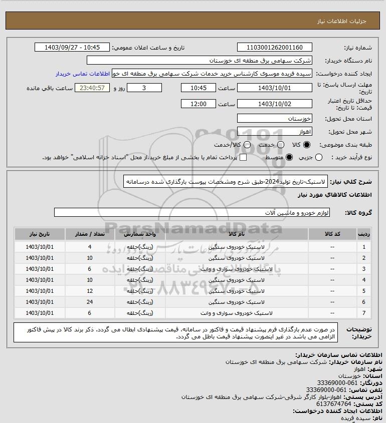 شرح کلی نیاز: لاستیک-تاریخ تولید2024-طبق شرح ومشخصات پیوست بارگذاری شده درسامانه