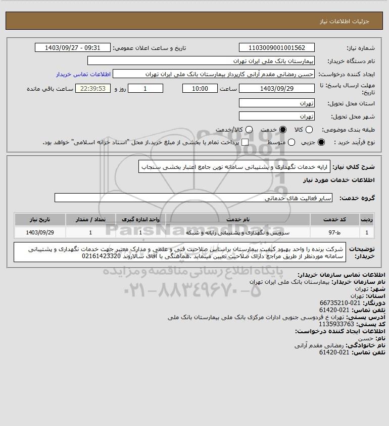 نام دستگاه خریدار:بیمارستان بانک ملی ایران تهران