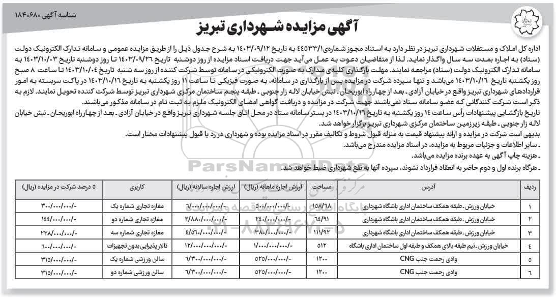 اداره کل املاک و مستغلات شهرداری تبریز در نظر دارد به استناد مجوز شماره ی 44533.1 به تاریخ 1403.9.12 به شرح جدول ذیل را از طریق مزایده عمومی و سامانه تدارک الکترونیک دولت (ستاد) به اجاره بمدت سه سال واگذار نماید. لذا از متقاضیان دعوت به عمل می آید جهت دریافت اسناد مزایده از روز دوشنبه تاریخ 1403.9.26 تا روز دوشنبه تاریخ 1403.10.3 به سامانه تدارک الکترونیک دولت (ستاد) مراجعه نمایند