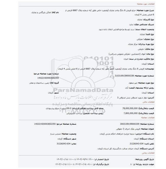 شرح مورد معامله: حراج فروش 6 دانگ واحد تجاری (وضعیت خاص طلق )به شماره پلاک 6667 فرعی از 6 اصلی بخش 4 کرماننام کالا: اماکن بازرگانی و تجاری