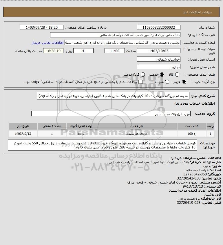 شرح کلی نیاز: سیستم نیروگاه خورشیدی 10 کیلو وات در بانک ملی شعبه فاروج (طراحی، تهیه لوازم، اجرا و راه اندازی)