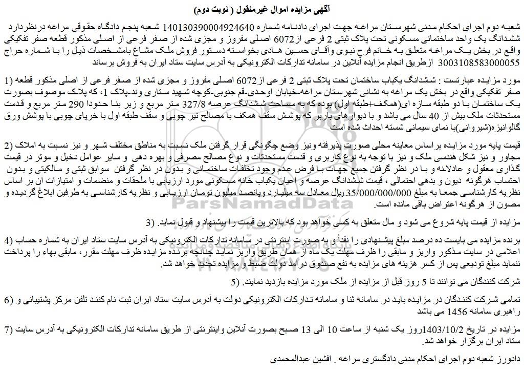 شعبه دوم اجرای احکام مدنی شهرستان مراغه جهت اجرای دادنامه شماره 140130390004924640 شعبه پنجم دادگاه حقوقی مراغه درنظردارد ششدانگ یک واحد ساختمانی مسکونی تحت پلاک ثبتی 2 فرعی از6072 اصلی مفروز و مجزی شده از صفر فرعی از اصلی مذکور قطعه صفر تفکیکی واقع در بخش یک مراغه متعلق به خانم فرح نبوی وآقای حسین هادی بخواسته دستور فروش ملک مشاع بامشخصات ذیل را با شماره حراج 3003108583000055 ازطریق انجام مزایده آنلاین در سامانه تدارکات الکترونیکی به آدرس سایت ستاد ایران به فروش برساند