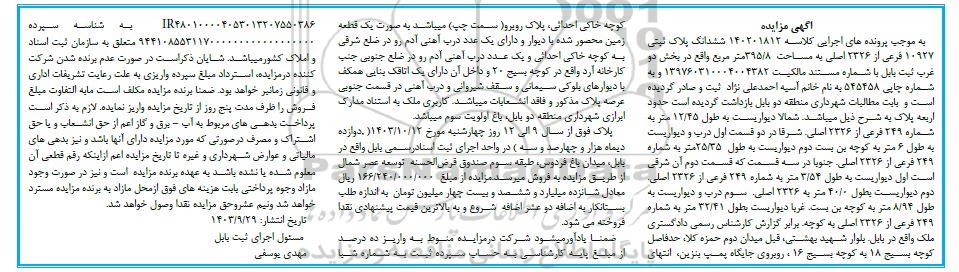 مزایده فروش ملک به پلاک ثبتی 10927 فرعی از 2326 اصلی به مساحت 395.8 مترمربع