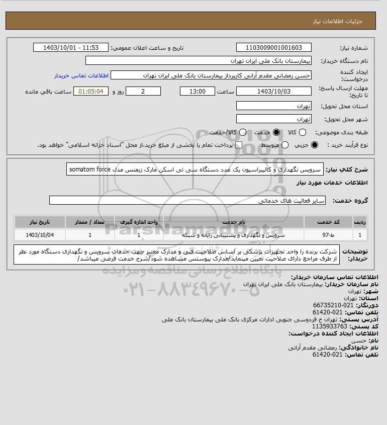 شرح کلی نیاز: سرویس نگهداری و کالیبراسیون یک عدد دستگاه سی تی اسکن مارک زیمنس مدل somatom force
