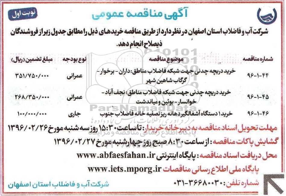 شرکت آب و فاضلاب استاناصفهان در نظر دارد از طریق مناقصه خریدهای ذیل را مطابق جدول زیر از فروشندگان ذیصلاح انجام دهد