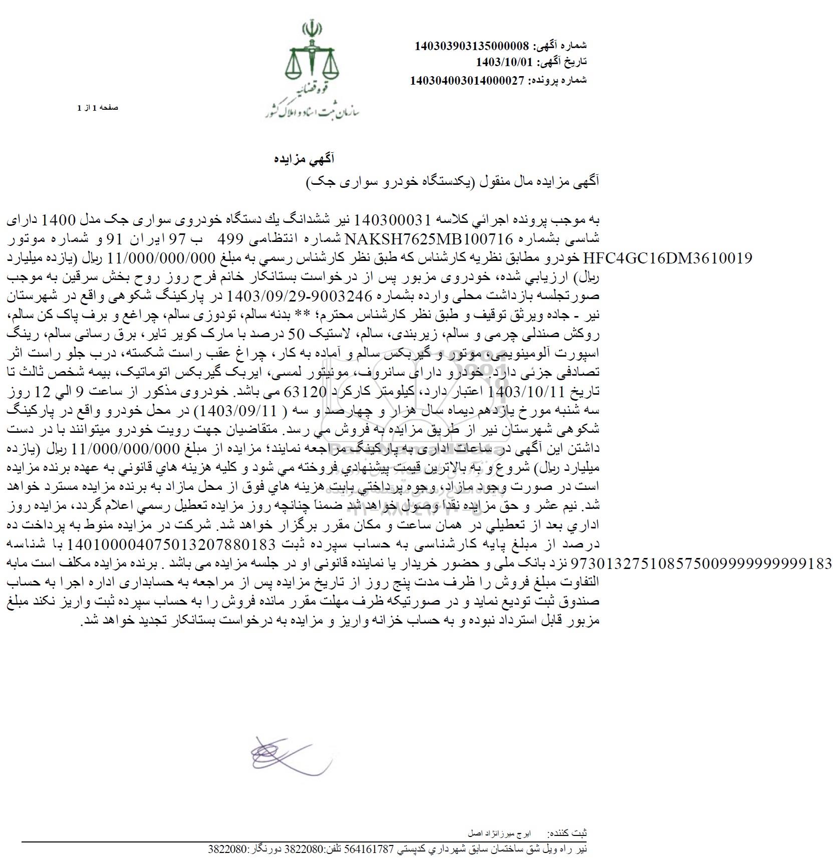 موضوع مزایده : یک دستگاه خودروی سواری جک مدل 1400 به ارزش 11.000.000.000 ریال
