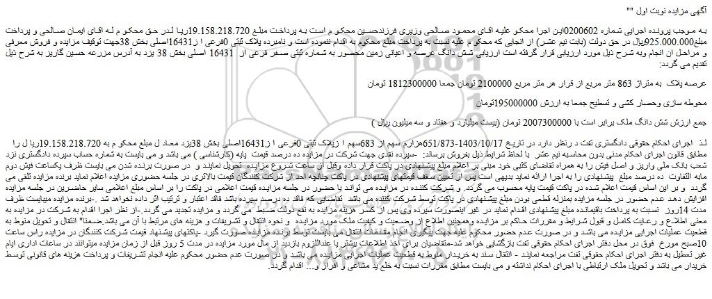 به موجب پرونده اجرایی شماره 0200602این اجرا محکو علیه اقای محمود صالحی وزیری فرزندحسین محکو م است به پرداخت مبلغ 19.158.218.720ریا لدر حق محکو م له اقای ایمان صالحی و پرداخت مبلغ925.000.000ریال در حق دولت (بابت نیم عشر) از انجایی که محکو م علیه نسبت به پرداخت مبلغ محکوم به اقدام ننموده است و نامبرده پلاک ثبتی 0فرعی ا ز16431اصلی بخش 38جهت توقیف مزایده و فروش معرفی و مراحل ان انجام وبه شرح ذیل مورد ارزیابی قرار گرفته است ارزیابی شش دانگ عرصه و اعیانی زمین محصور به شماره ثبتی صفر فرعی از 16431 اصلی بخش 38 یزد به آدرس مزرعه حسین گاریز به شرح ذیل تقدیم می گردد: