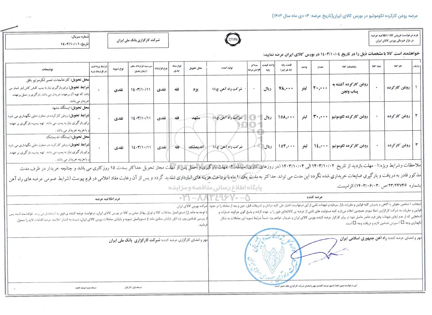 خواهشمند است کالا با مشخصات ذیل را در تاریخ 1403.10.4 در بورس کالای ایران عرضه نمایید: