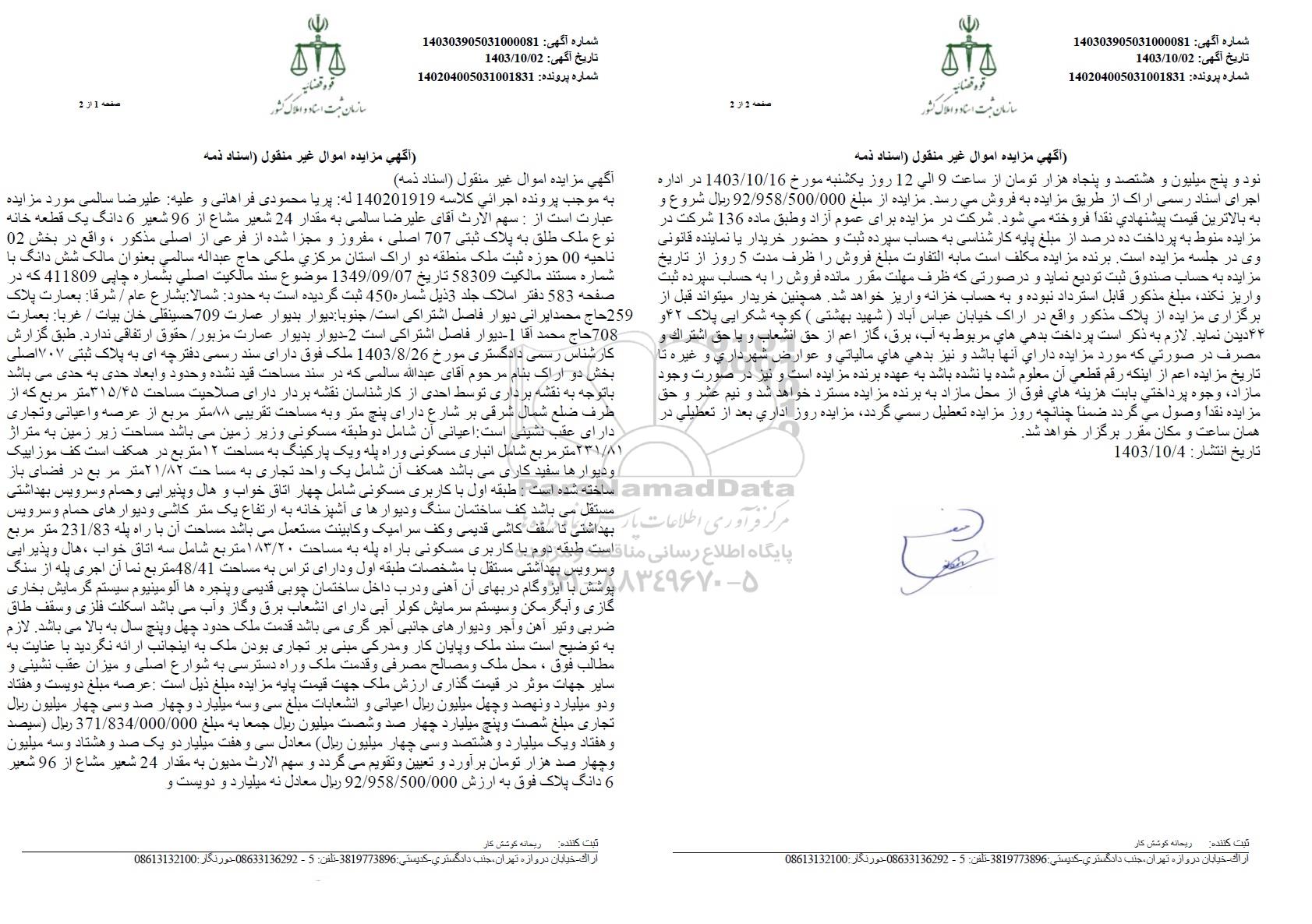 مزایده فروش ششدانگ یک قطعه خانه به پلاک ثبتی 707 اصلی مفروز و مجزا شده از فرعی از اصلی مذکور به مبلغ 92.958.500.000 ریال