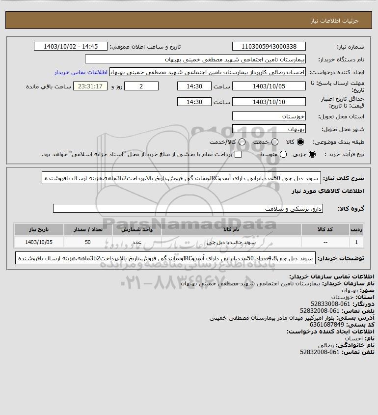 | 1 | -- | سوند حالب یا دبل جی | عدد | 50 | 1403/10/05 |
