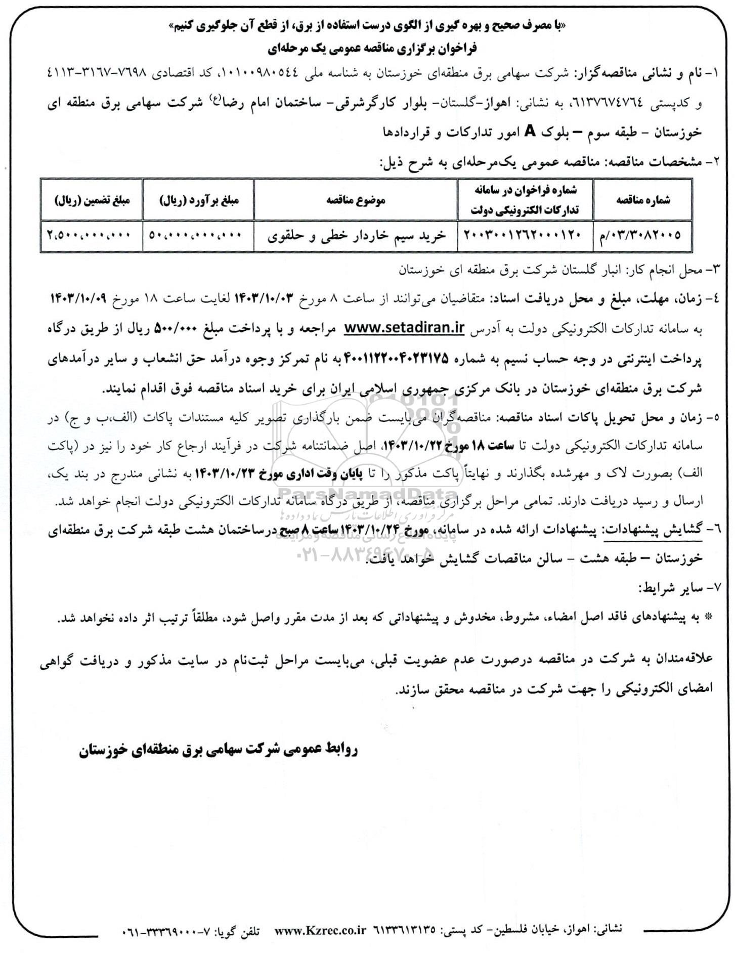 نام و نشانی مناقصه گزار: شرکت سهامی برق منطقه ای خوزستان به شناسه ملی 10100980544 کد اقتصادی 7698-3167-4413 و کدپستی 6137674764 به نشانی اهواز - گلستان بلوار کارگر شرقی ساختمان امام رضا (ع) شرکت سهامی برق منطقه ای خوزستان - طبقه سوم - بلوک A امور تدارکات و قراردادها