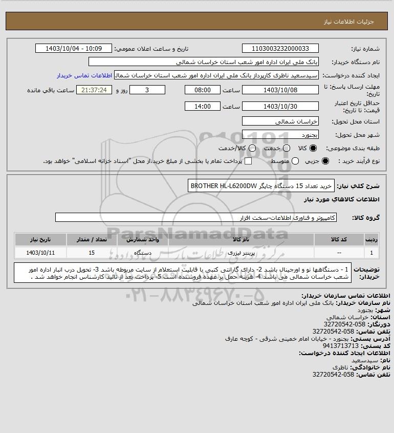 نام دستگاه خریدار:بانک ملی ایران اداره امور شعب استان خراسان شمالی