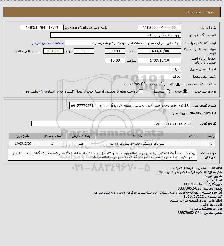 شرح کلی نیاز: 18 قلم لوازم خودرو،طبق فایل پیوستی_هماهنگی با آقای شهبازی09127779571