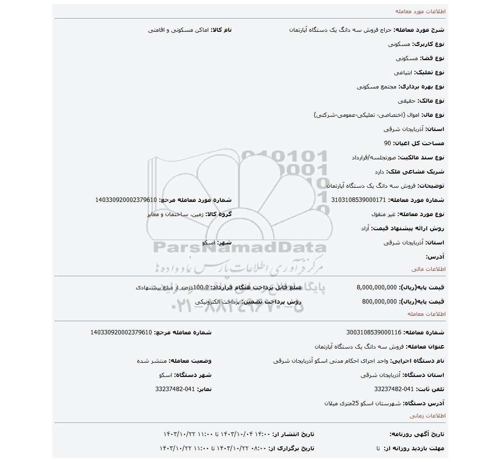 | شرح مورد معامله: حراج فروش سه دانگ یک دستگاه آپارتمان | نام کالا: اماکن مسکونی و اقامتی | |
