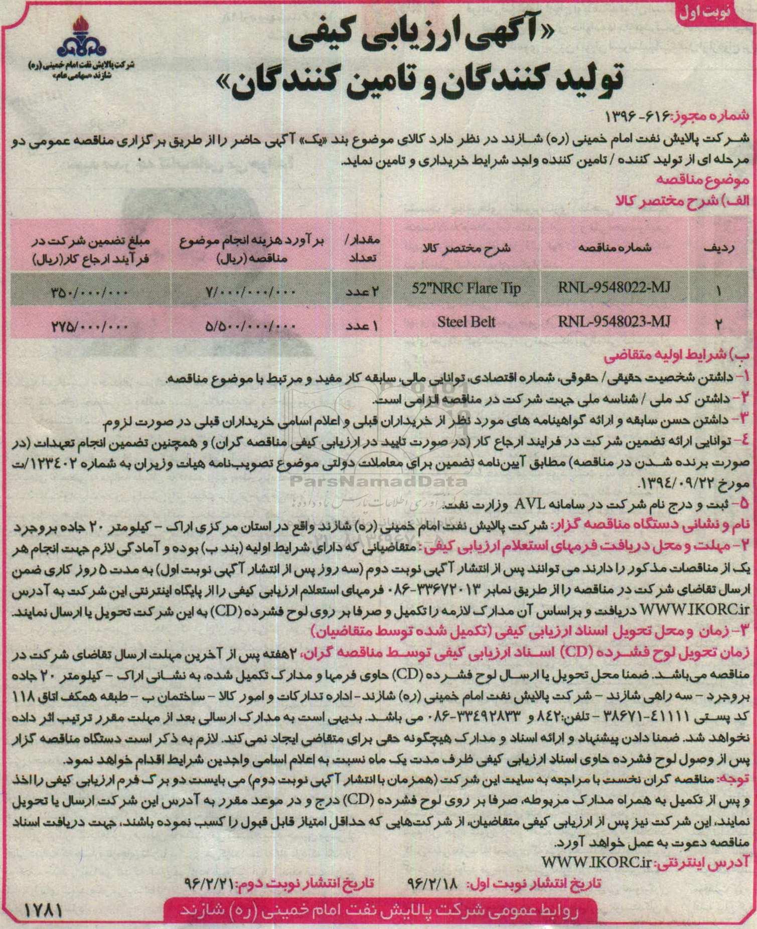 شرکت پالایش نفت امام خمینی (ره) شازند در نظر دارد کالاهای موضوع بند یک آگهی حاضر را از طریق برگزاری  مناقصه عمومی دو مرحله ای از تولیدکننده/ تامین کننده  واجد شرایط خریداری و تامین نماید.