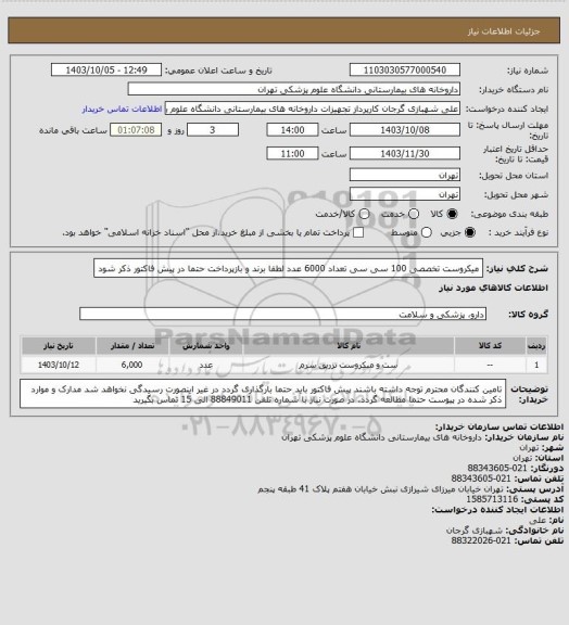 شرح کلی نیاز: میکروست تخصصی 100 سی سی تعداد 6000 عدد